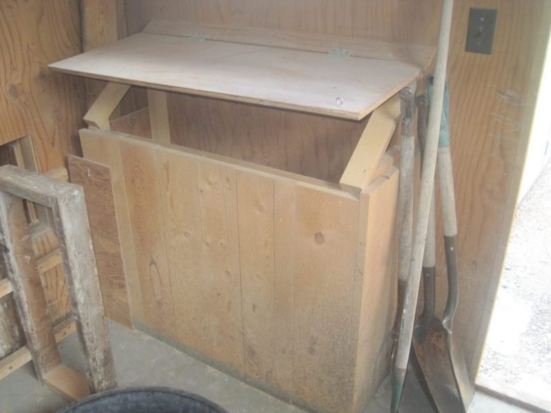 This storage can hold four 50-pound sacks of feed. Having it inside the coop saves time and makes it easier to handle the sacks.
