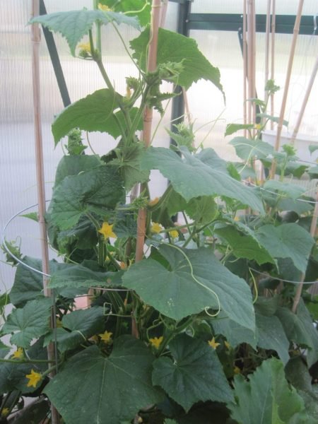 We use bamboo stakes and wire cages for the extra needed support for all our cucumber and vining plants.
