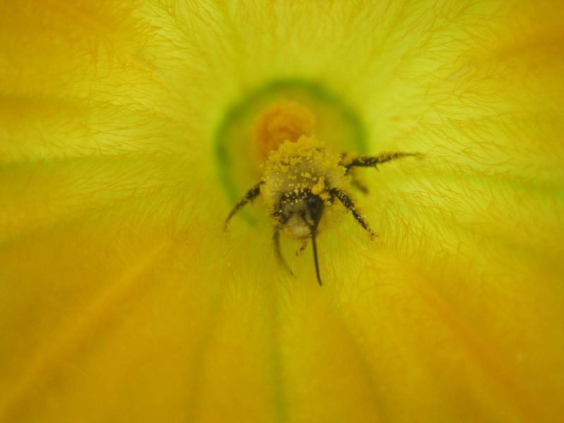 The bee was covered in fresh pollen, almost like she was drunk from it. This female worker bee crawled inside a male zucchini blossom. When she tried to escape, she was so weighed down with pollen that she fell back into the flower.