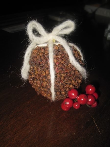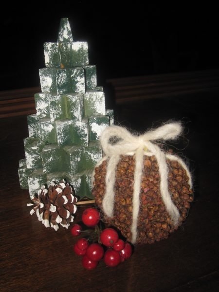 You can get quite creative with your carved design, clove patterns, and your choice of decorative ribbon. I have used 1/4″ grosgrain ribbon and even velvet ribbon. Handspun yarn adds a nice rustic touch!