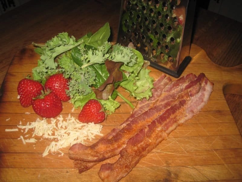 - If adding bacon, sprinkle the diced cooked bacon pieces over greens and strawberries.